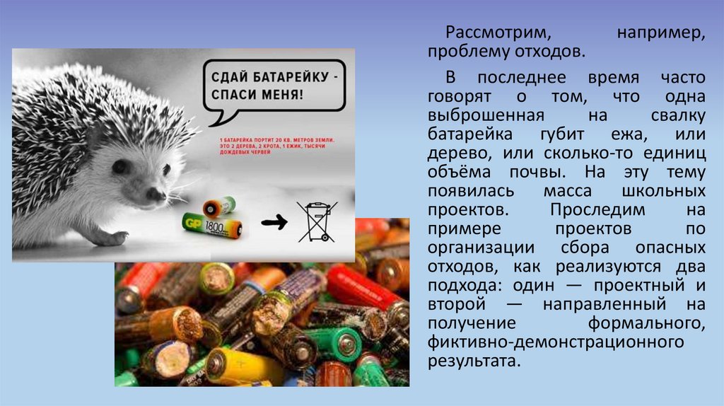 Если же расширить фокус зрения и посмотреть пусть даже на один мини-проект посбору батареек как на реальное действие по решению проблемы утилизации отходов,