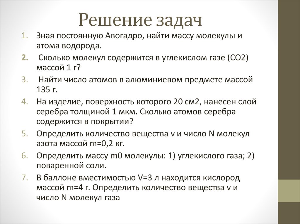Решение задач1. Зная постоянную Авогадро, найти массу молекулы и