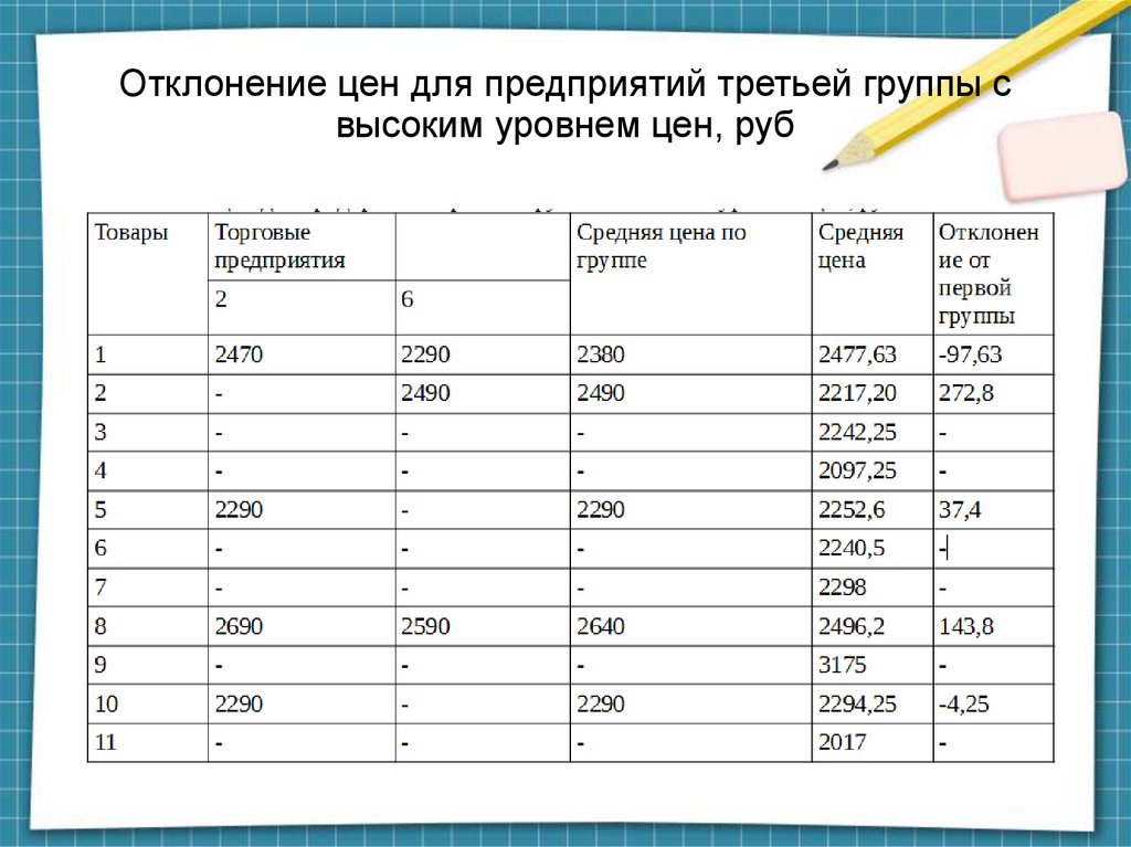 Отклонение цен для предприятий третьей группы свысоким уровнем цен, руб