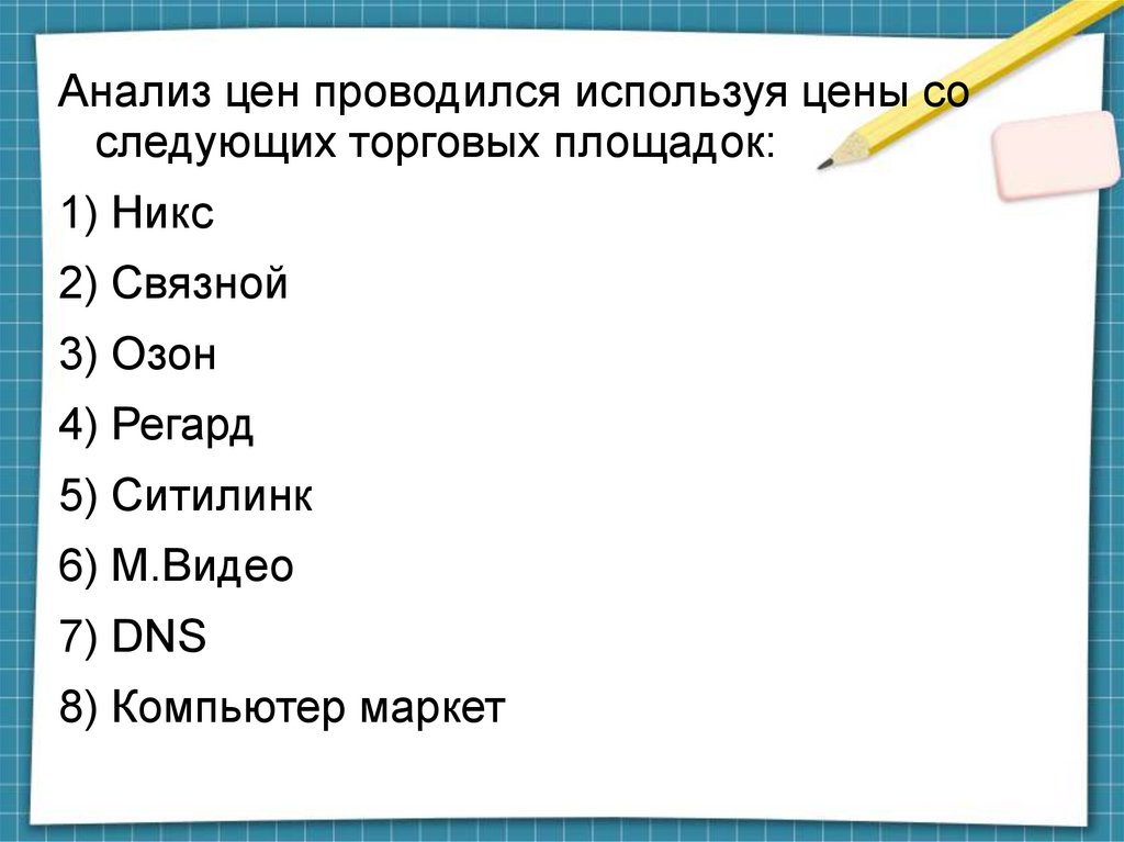 Анализ цен проводился используя цены соследующих торговых площадок: