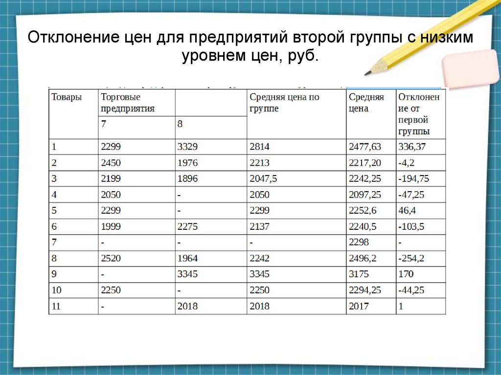 Отклонение цен для предприятий второй группы с низкимуровнем цен, руб.