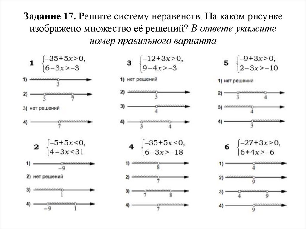 Задание 17. Решите систему неравенств. На каком рисункеизображено множество её решений? В ответе укажите