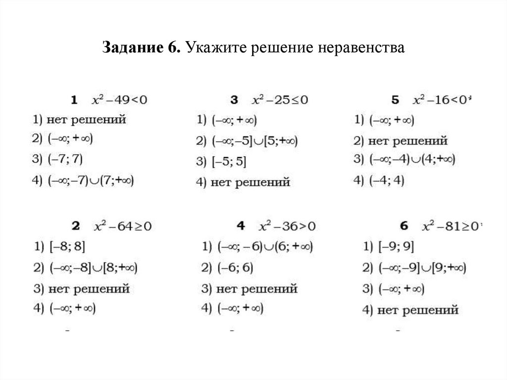 II) Квадратные неравенстваЗадание 4. Укажите решение неравенства
