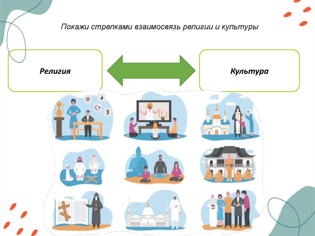 Покажи стрелками взаимосвязь религии и культурыРелигия