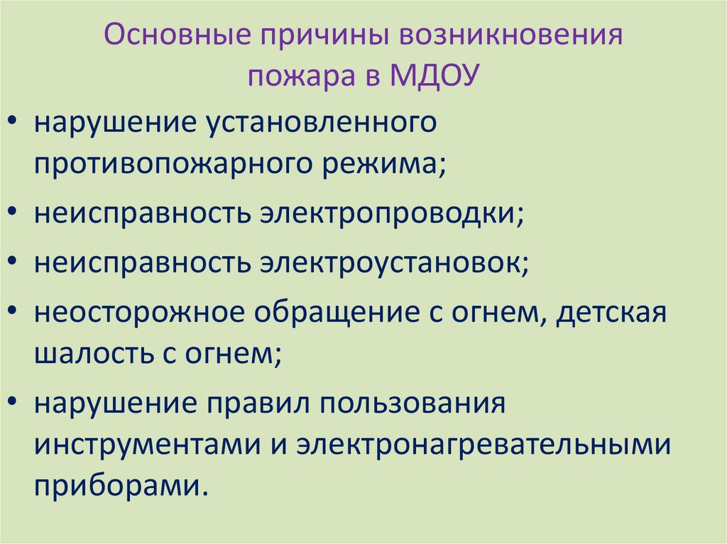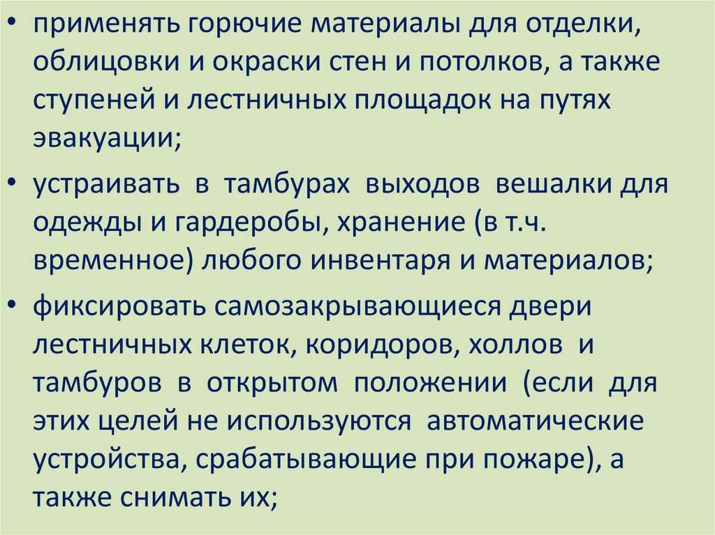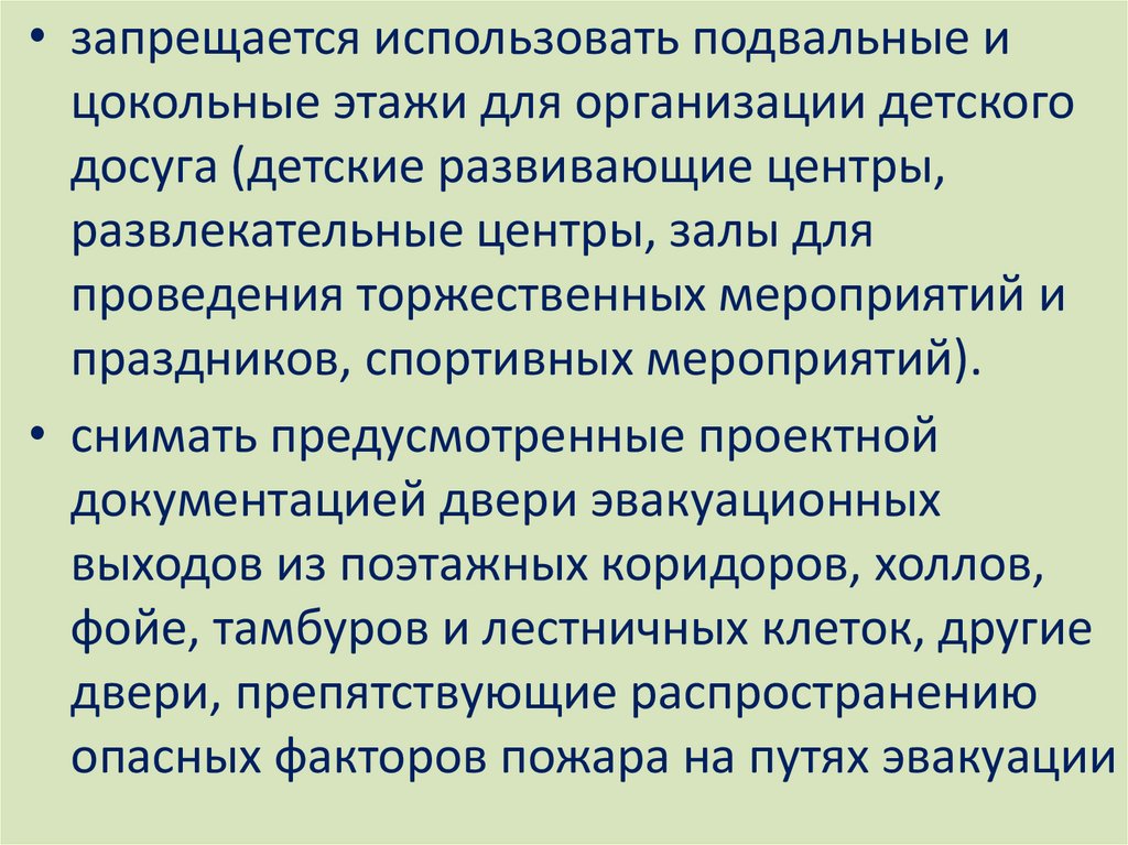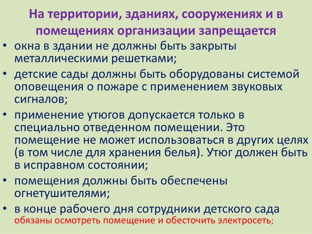 Внутри здания детского садика правила пожарнойбезопасности устанавливают ряд мер и требований: