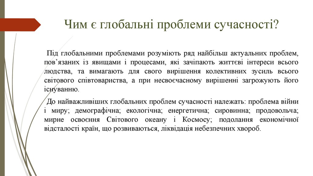 Чим є глобальні проблеми сучасності?Під глобальними проблемами розуміють ряд найбільш актуальних проблем,