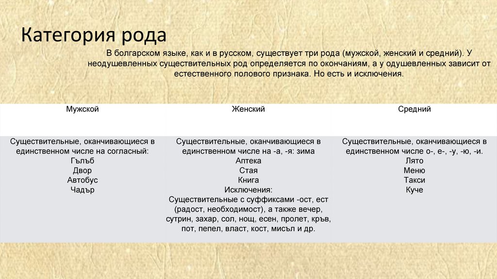 Категория родаВ болгарском языке, как и в русском, существует три рода (мужской, женский и средний). У