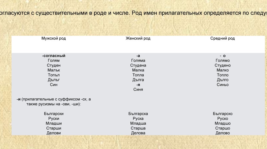 огласуются с существительными в роде и числе. Род имен прилагательных определяется по следуюМужской род