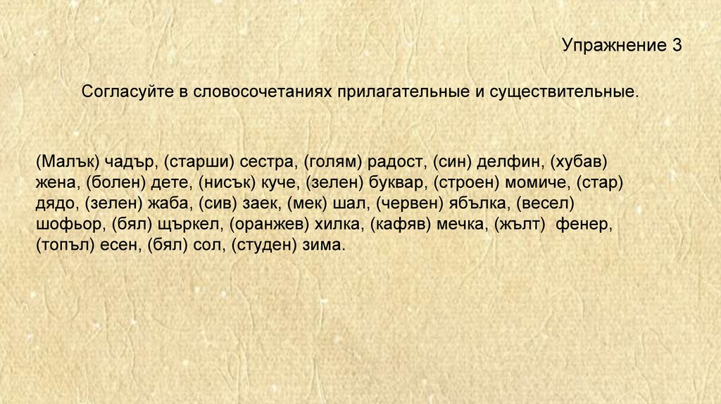 Упражнение 3Согласуйте в словосочетаниях прилагательные и существительные.