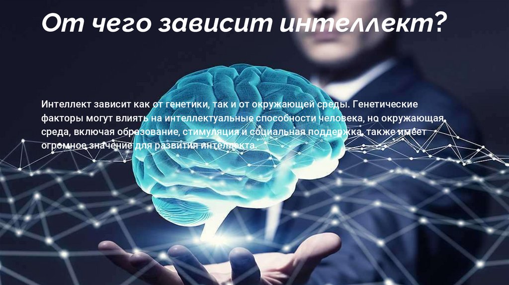 От чего зависит интеллект?Интеллект зависит как от генетики, так и от окружающей среды. Генетические