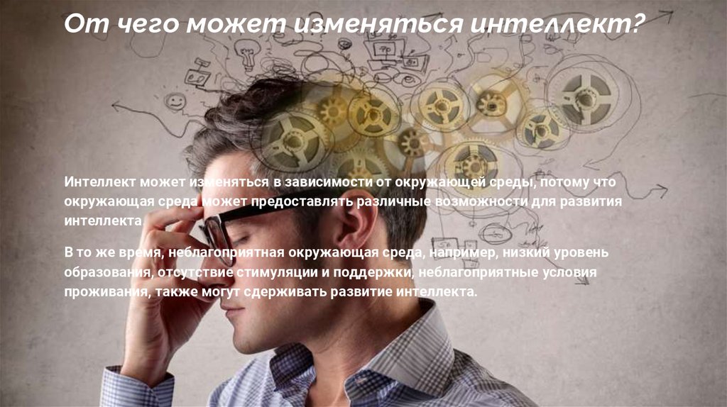 От чего может изменяться интеллект?Интеллект может изменяться в зависимости от окружающей среды, потому что