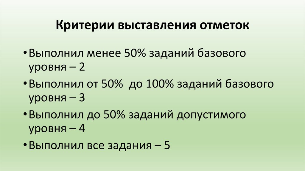 Критерии выставления отметок• Выполнил менее 50% заданий базового