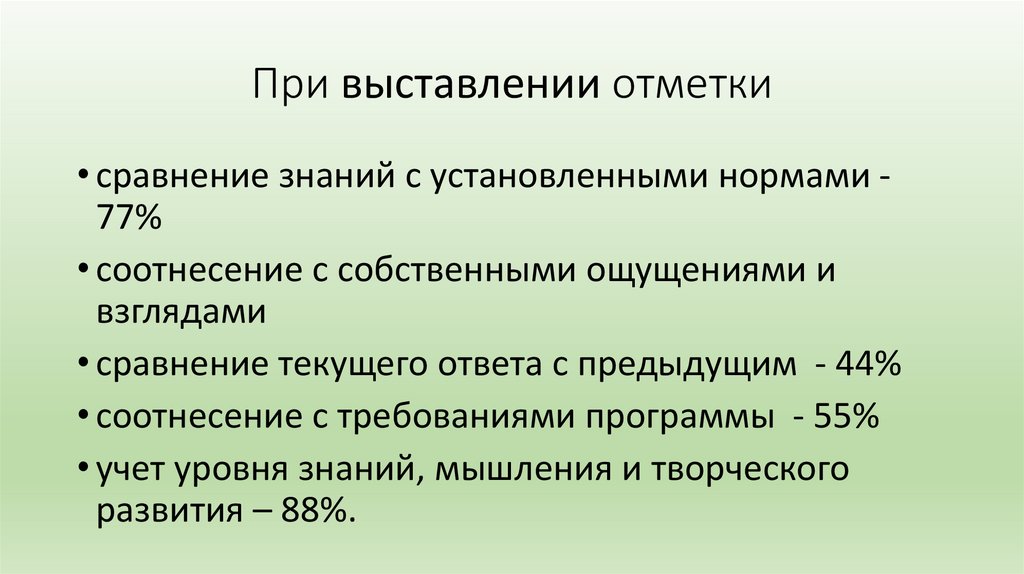 При выставлении отметки• сравнение знаний с установленными нормами 77%