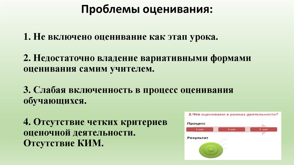 Проблемы оценивания:1. Не включено оценивание как этап урока.