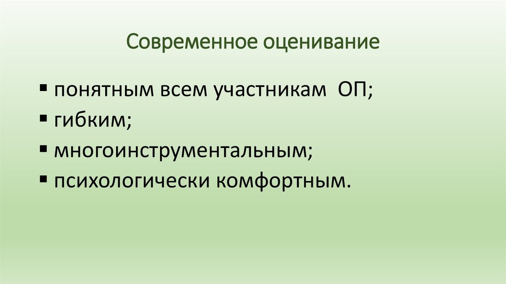 Современное оцениваниепонятным всем участникам ОП;