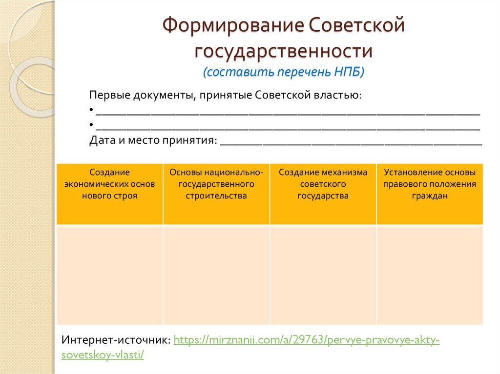 Интернет-источник: https://mirznanii.com/a/29763/pervye-pravovye-aktysovetskoy-vlasti/