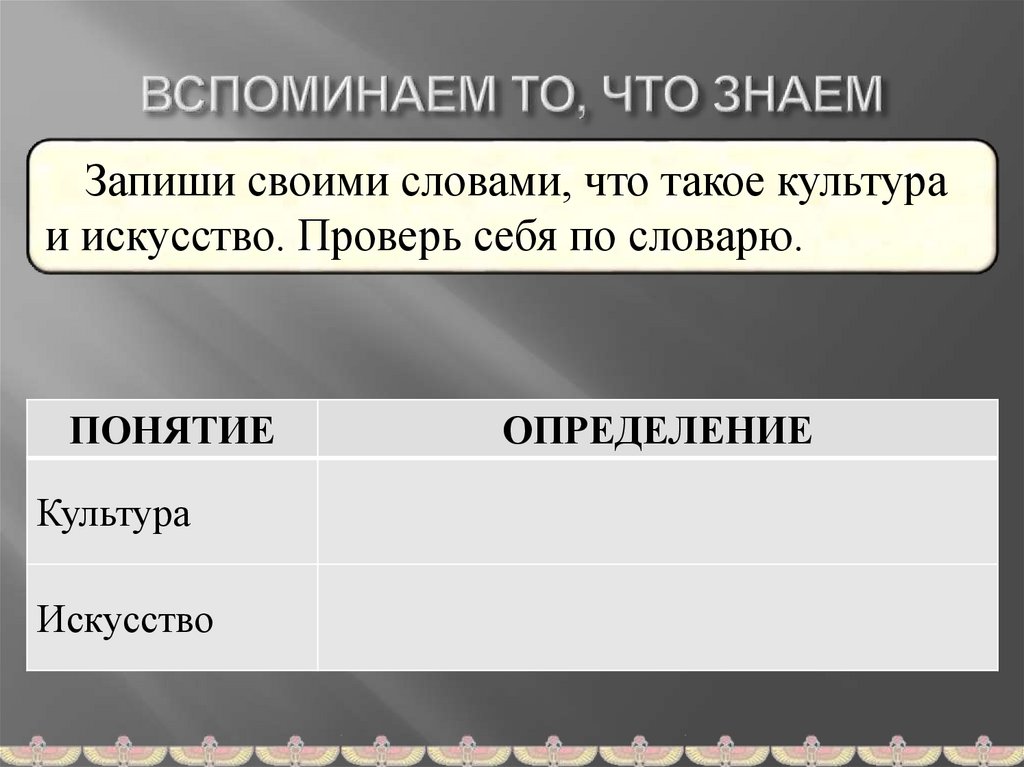 Запиши своими словами, что такое культураи искусство. Проверь себя по словарю.