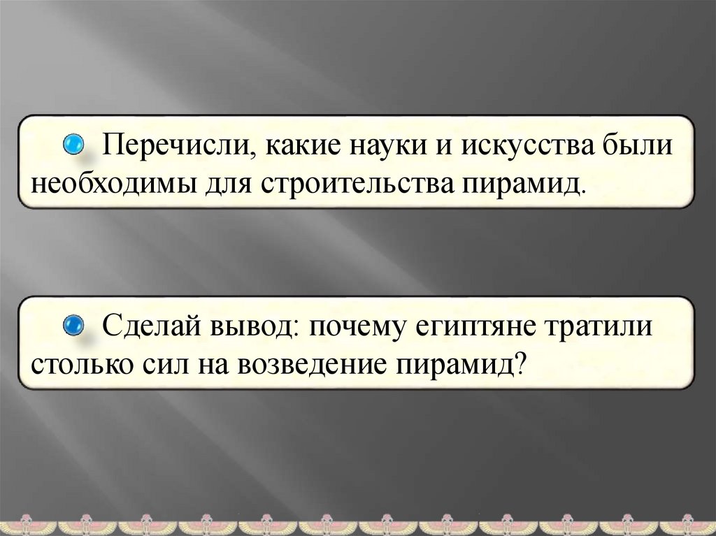 Перечисли, какие науки и искусства былинеобходимы для строительства пирамид.
