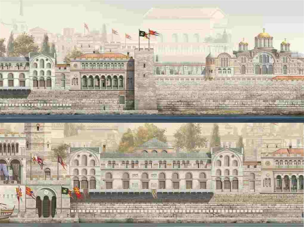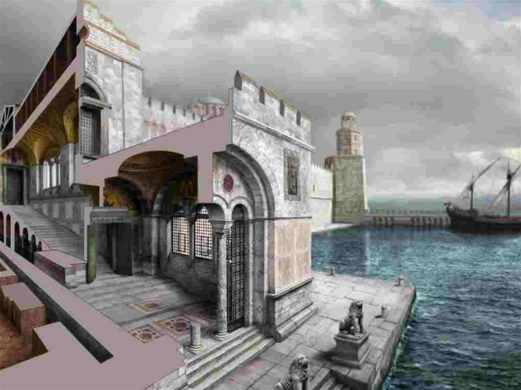 Гравюра, изображающая морской фасад дворцаВуколеон и маяк Фарос (середина 19 века)