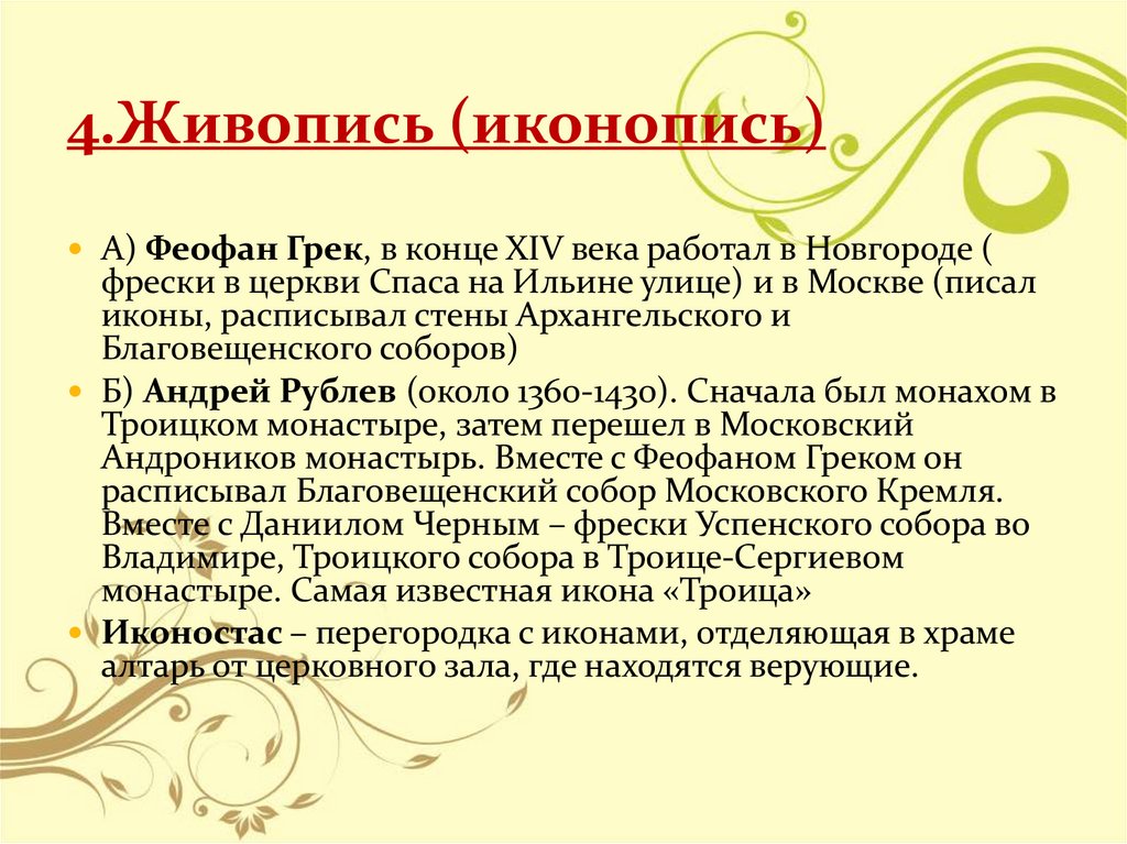 4.Живопись (иконопись)А) Феофан Грек, в конце XIV века работал в Новгороде (