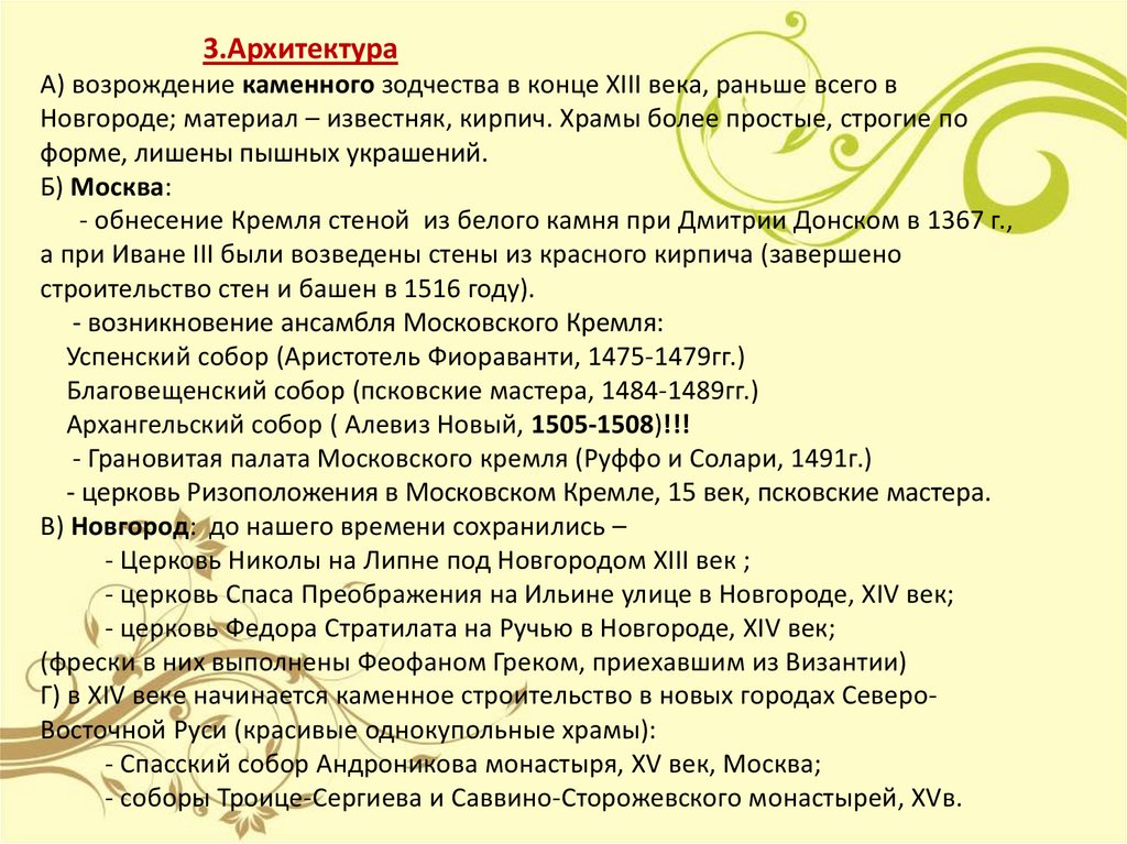 3.АрхитектураА) возрождение каменного зодчества в конце XIII века, раньше всего в