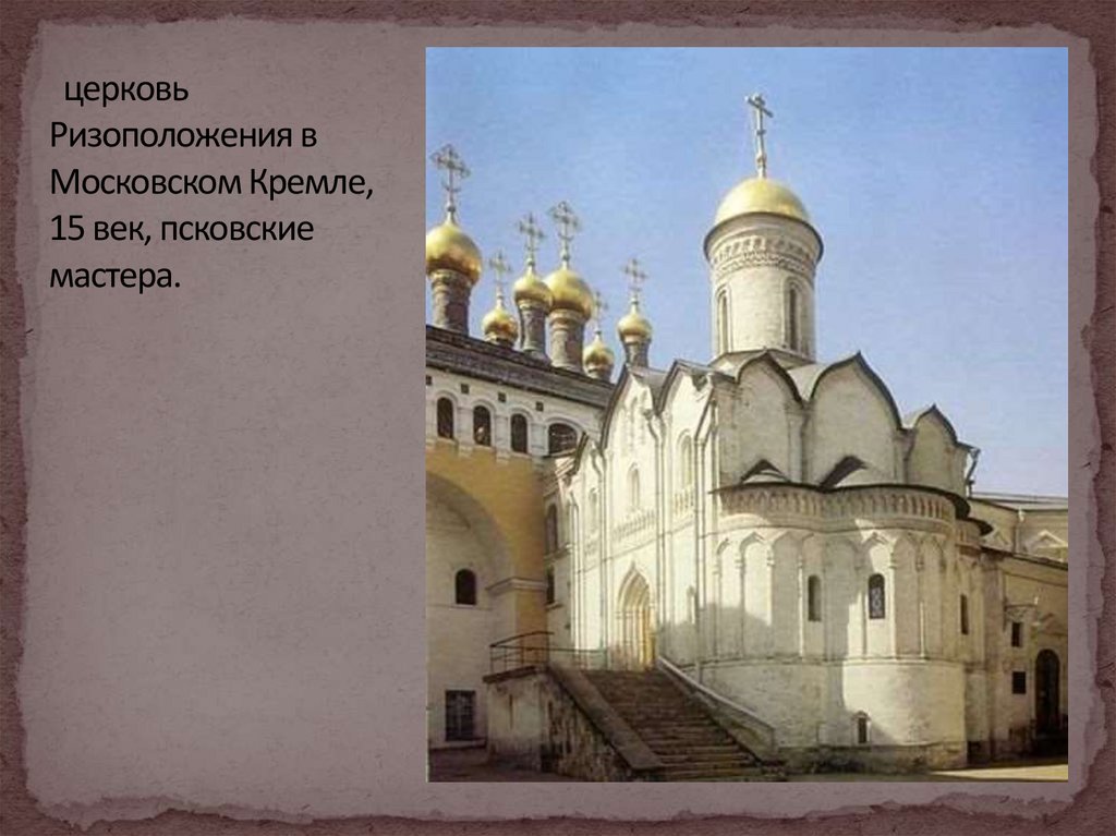 - церковь Ризоположения в Московском Кремле, 15 век, псковские мастера.