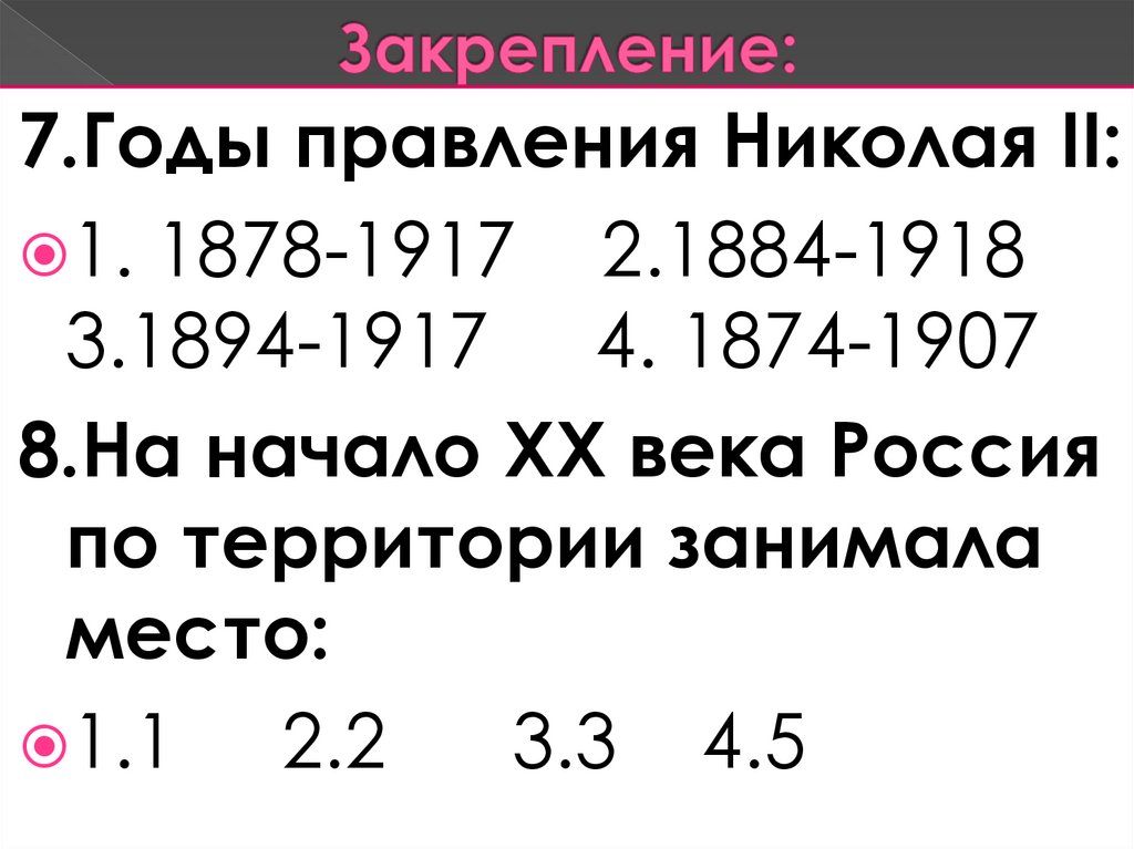 7.Годы правления Николая II:1. 1878-1917 2.1884-1918