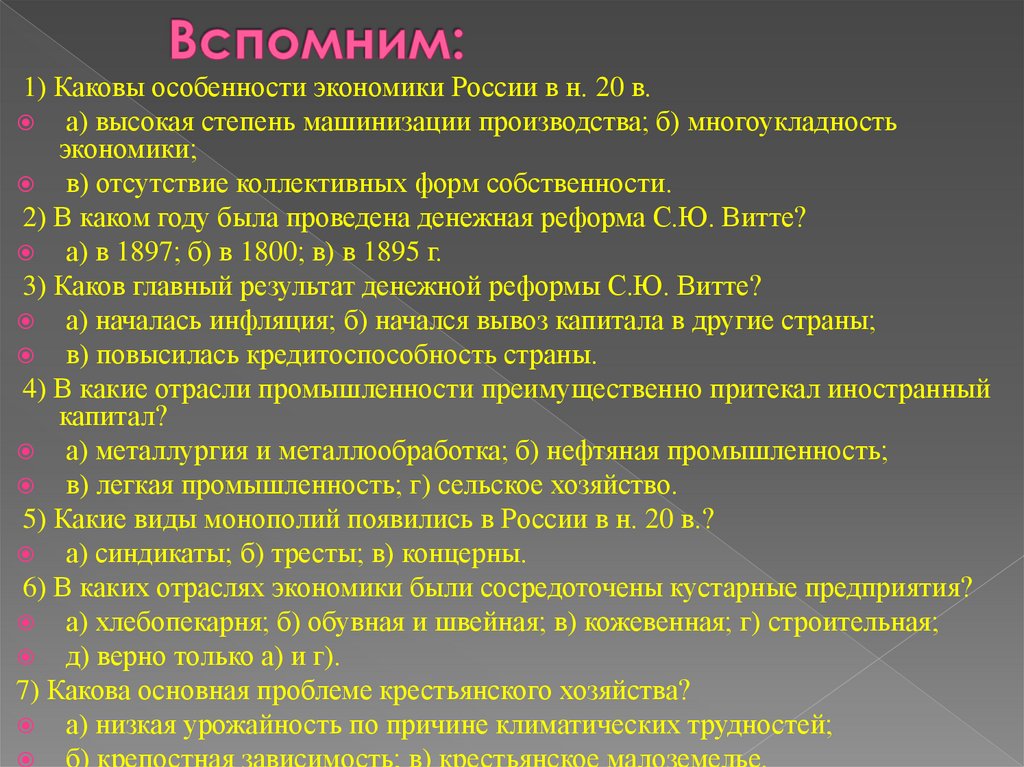 1) Каковы особенности экономики России в н. 20 в.а) высокая степень машинизации производства; б) многоукладность