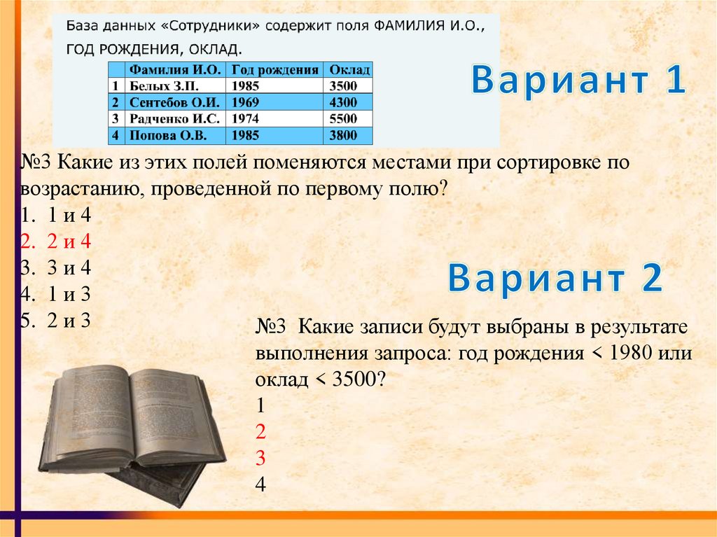 №3 Какие из этих полей поменяются местами при сортировке повозрастанию, проведенной по первому полю?