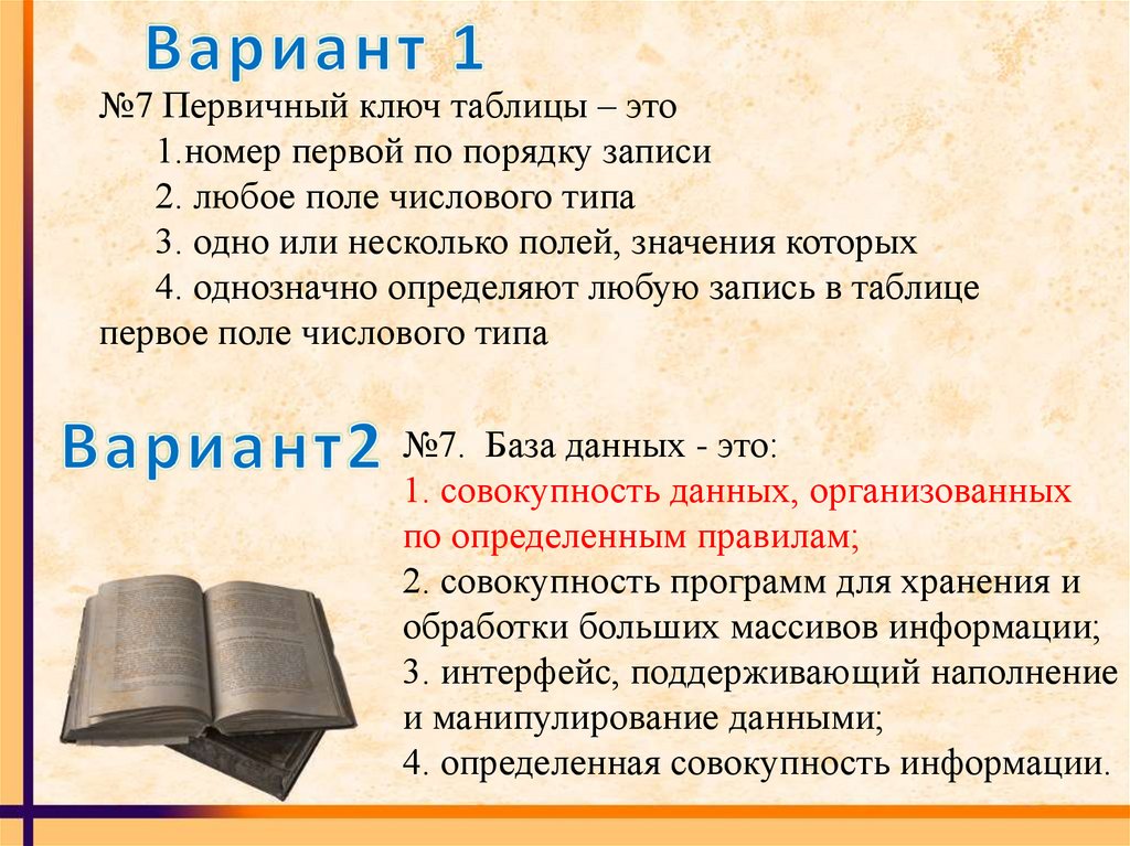 №7 Первичный ключ таблицы – это1.номер первой по порядку записи