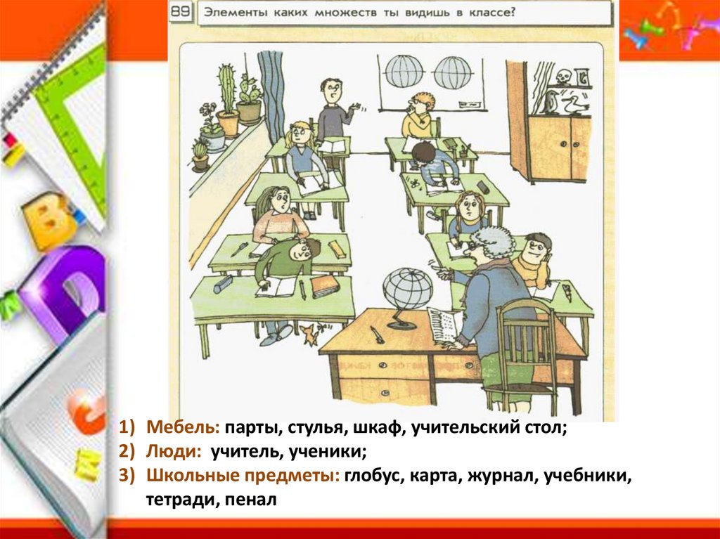 3) Школьные предметы: глобус, карта, журнал, учебники,