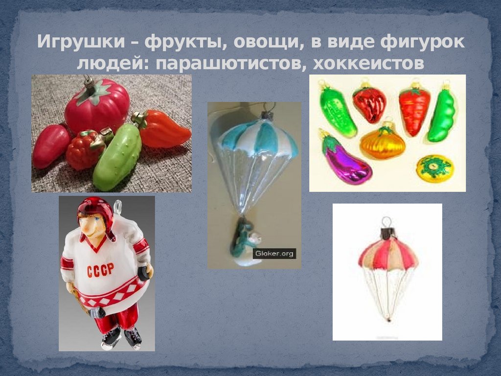 Игрушки – фрукты, овощи, в виде фигуроклюдей: парашютистов, хоккеистов