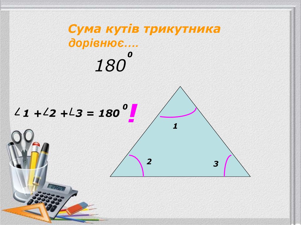 Сума кутів трикутникадорівнює….