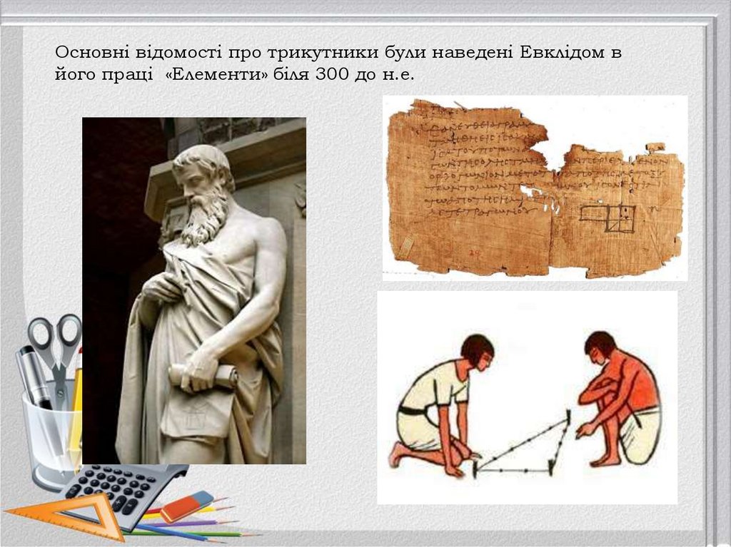 Основні відомості про трикутники були наведені Евклідом вйого праці «Елементи» біля 300 до н.е.