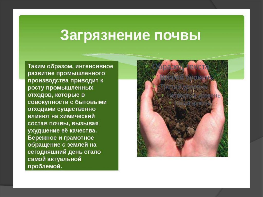 Почвы загрязняются различными вредными химическимивеществами, пестицидами, отходами сельского хозяйства,