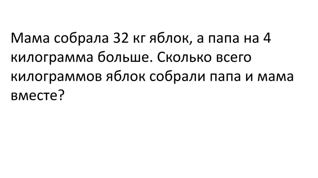 Мама собрала 32 кг яблок, а папа на 4килограмма больше. Сколько всего