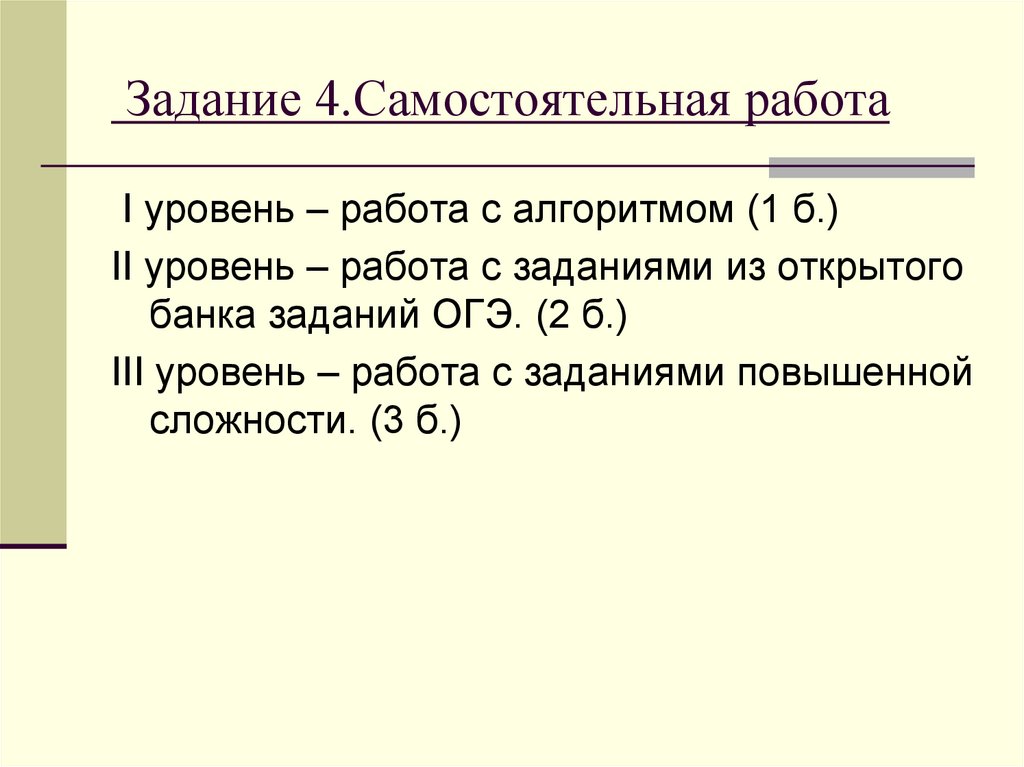 Задание 4.Самостоятельная работаI уровень – работа с алгоритмом (1 б.)