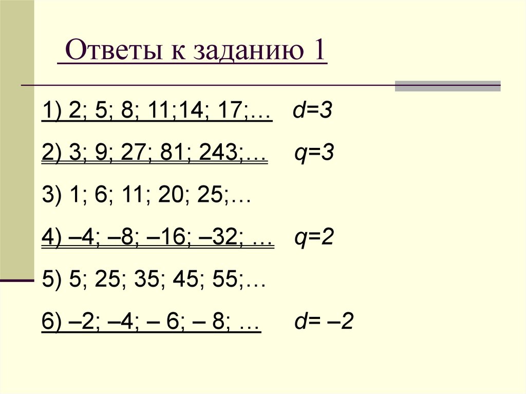 Ответы к заданию 11) 2; 5; 8; 11;14; 17;… d=3