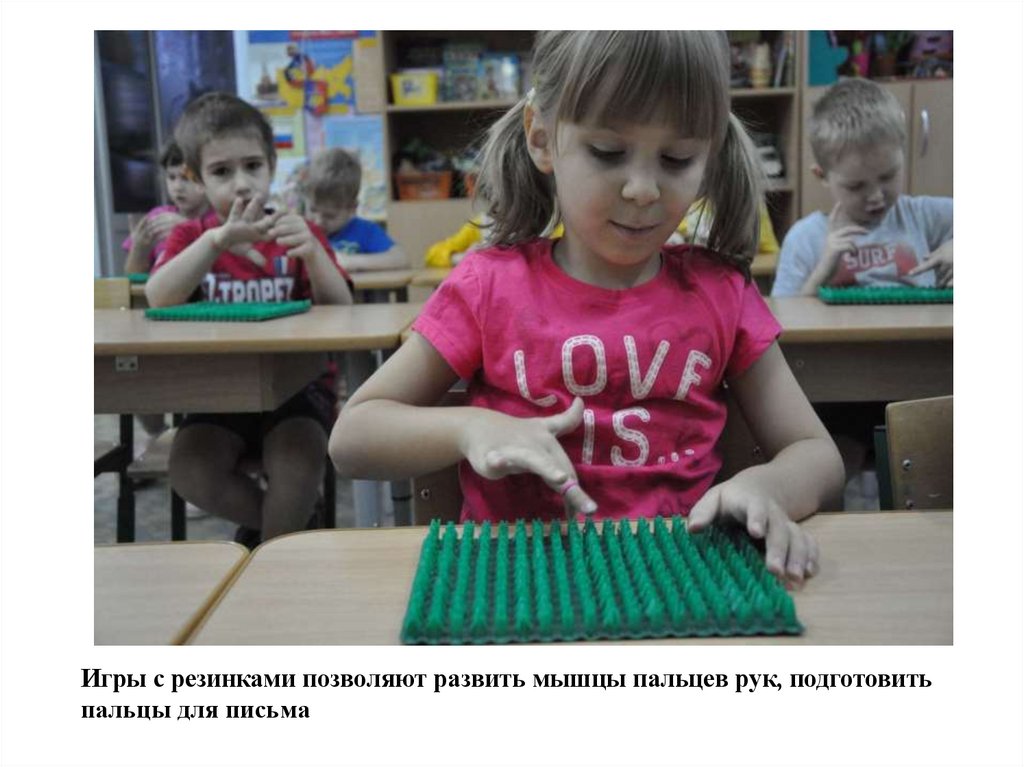 Игры с резинками позволяют развить мышцы пальцев рук, подготовитьпальцы для письма