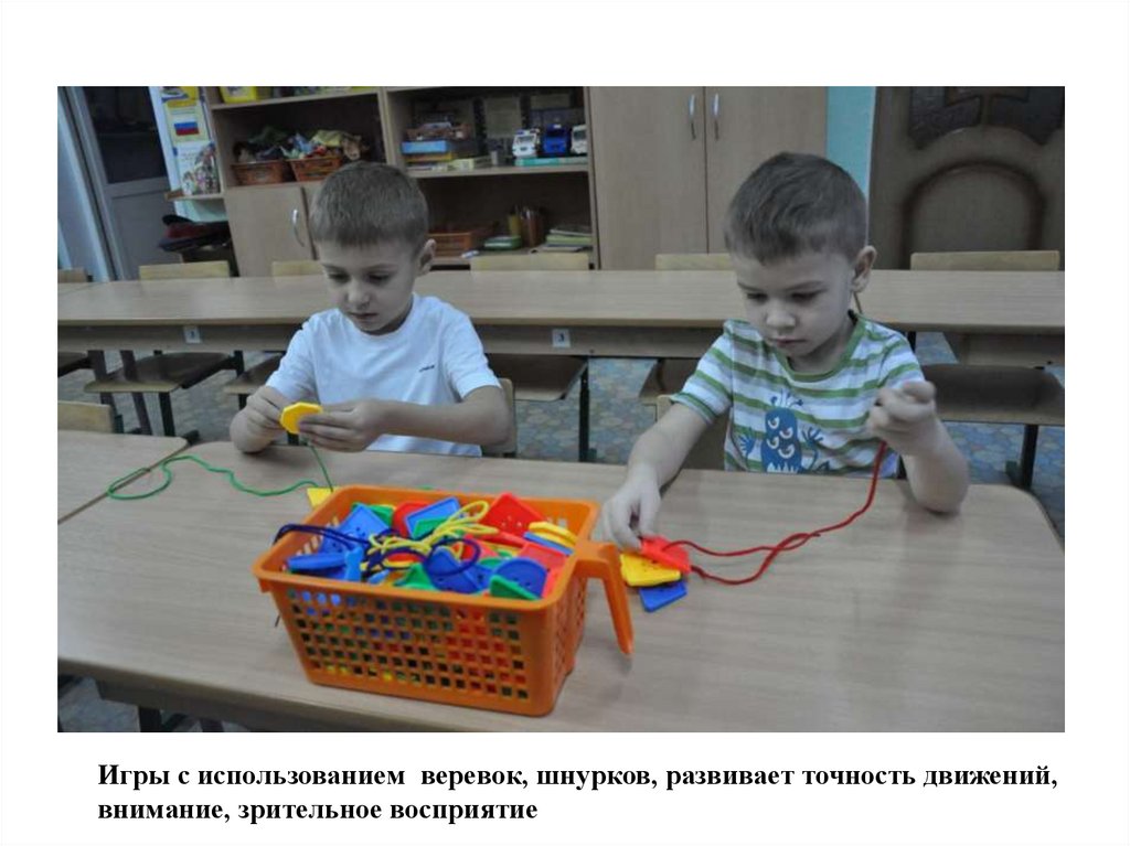 Игры с использованием веревок, шнурков, развивает точность движений,внимание, зрительное восприятие