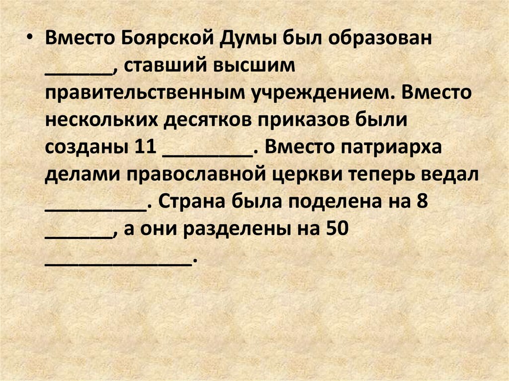 • Вместо Боярской Думы был образован______, ставший высшим