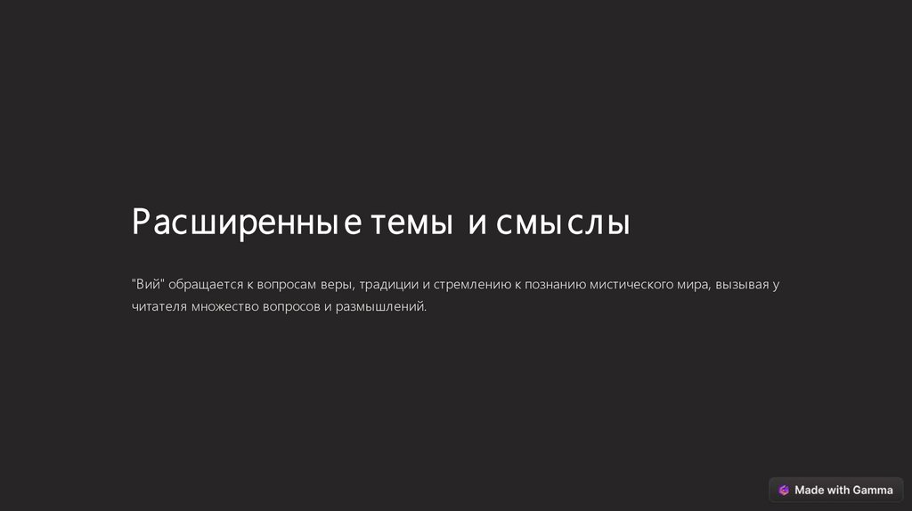 Расширенны е темы и смы слы"Вий" обращается к вопросам веры, традиции и стремлению к познанию мистического мира, вызывая у