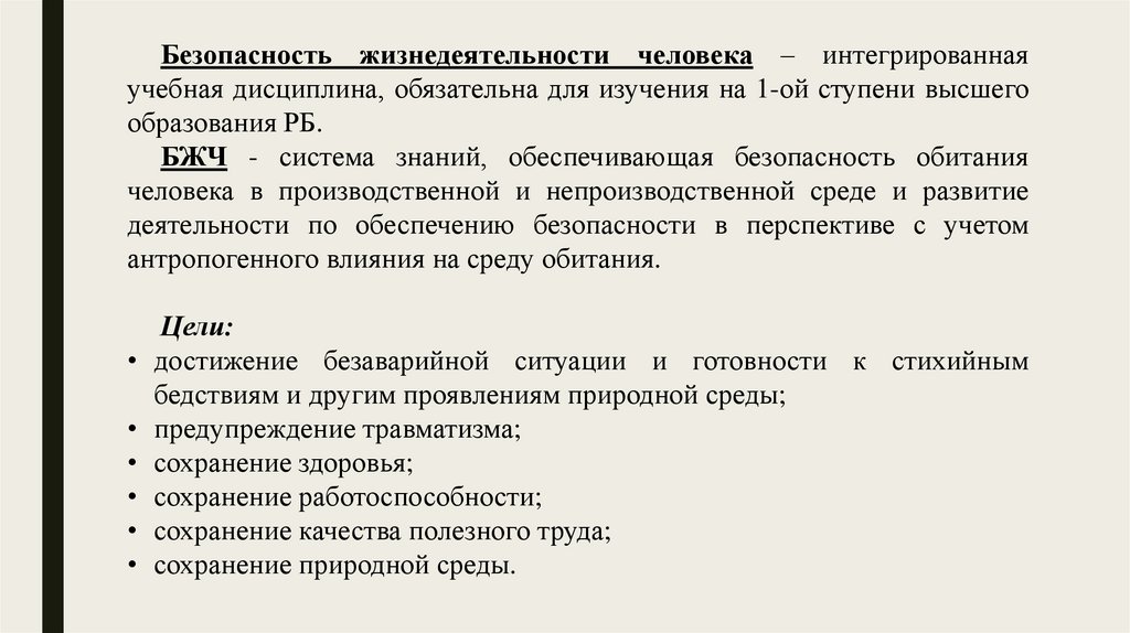 Безопасность жизнедеятельности человека – интегрированнаяучебная дисциплина, обязательна для изучения на 1-ой ступени высшего