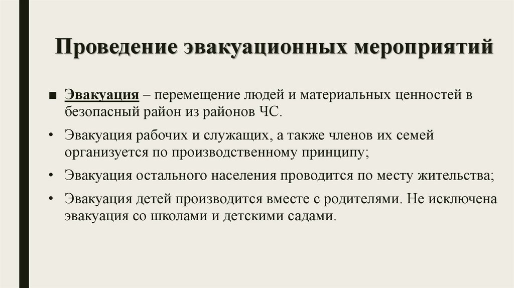 Проведение эвакуационных мероприятий■ Эвакуация – перемещение людей и материальных ценностей в