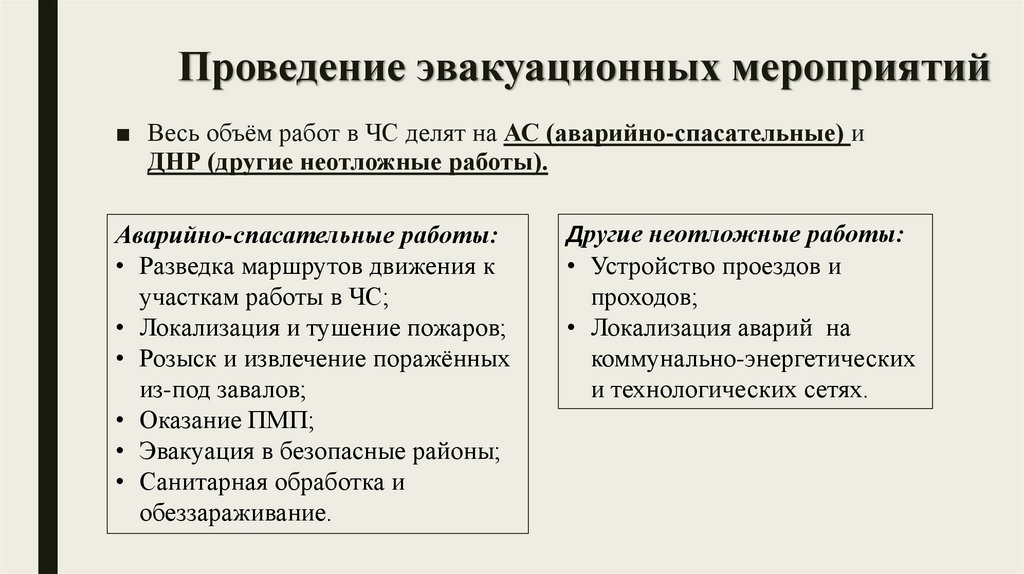 Проведение эвакуационных мероприятий■ Весь объём работ в ЧС делят на АС (аварийно-спасательные) и