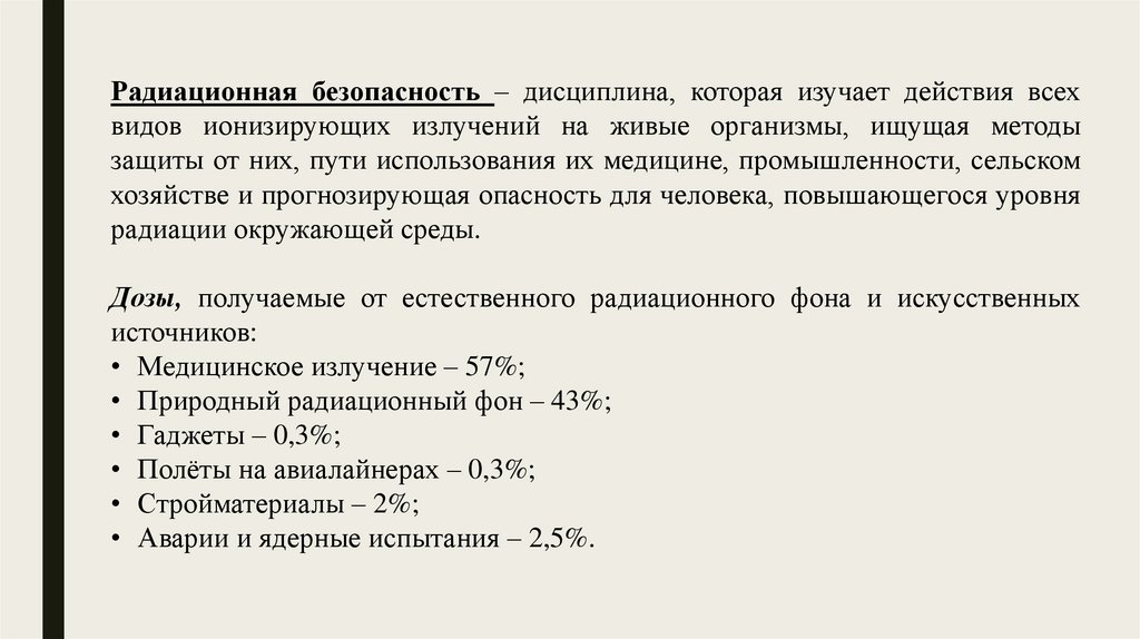 Радиационная безопасность – дисциплина, которая изучает действия всехвидов ионизирующих излучений на живые организмы, ищущая методы