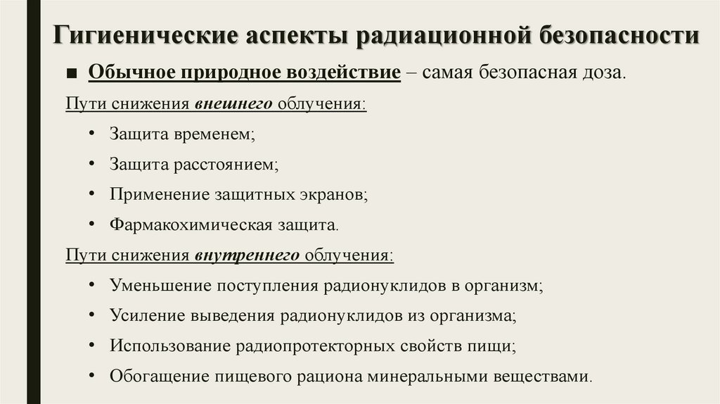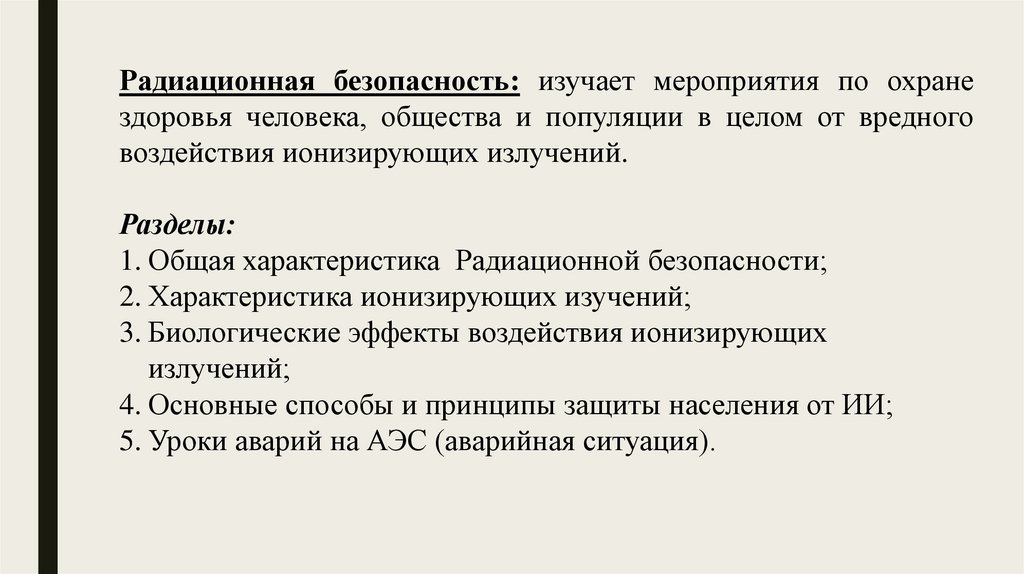 Радиационная безопасность: изучает мероприятия по охранездоровья человека, общества и популяции в целом от вредного