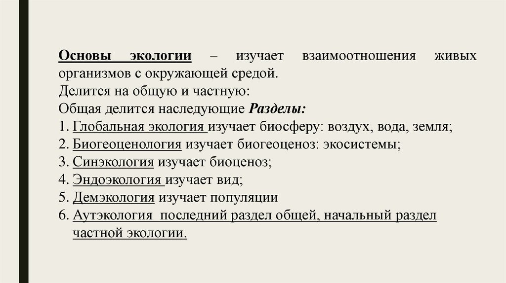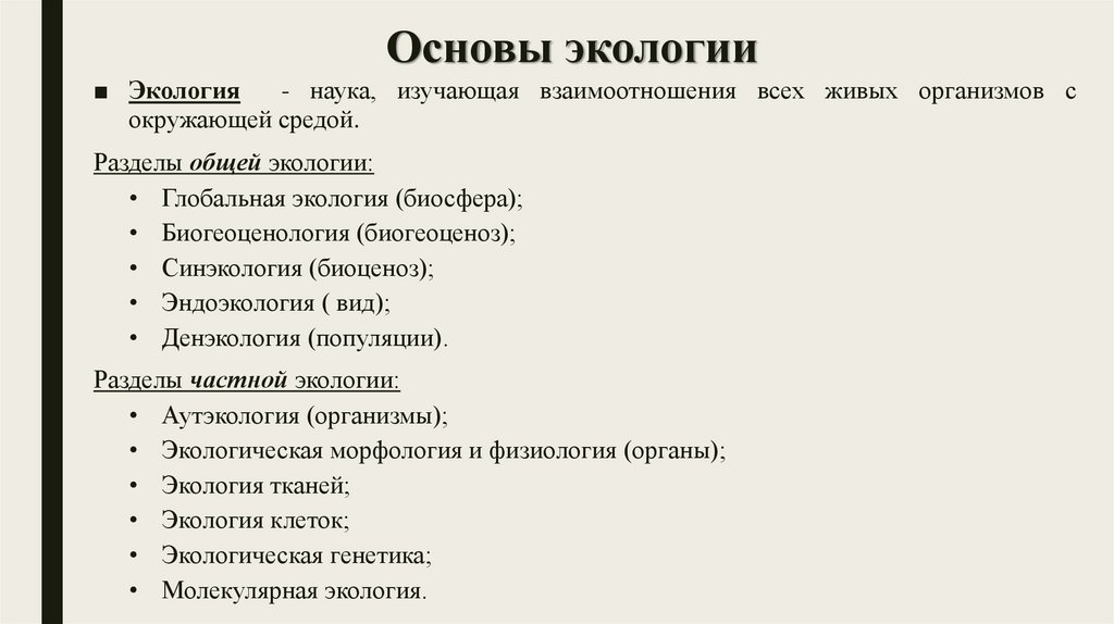 Основы экологии – изучает взаимоотношения живыхорганизмов с окружающей средой.