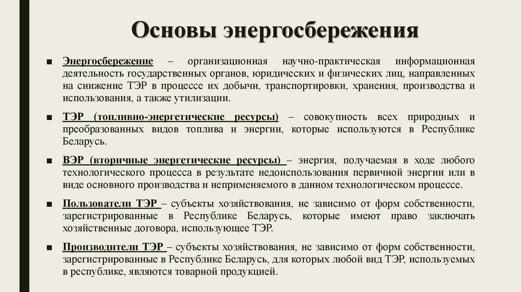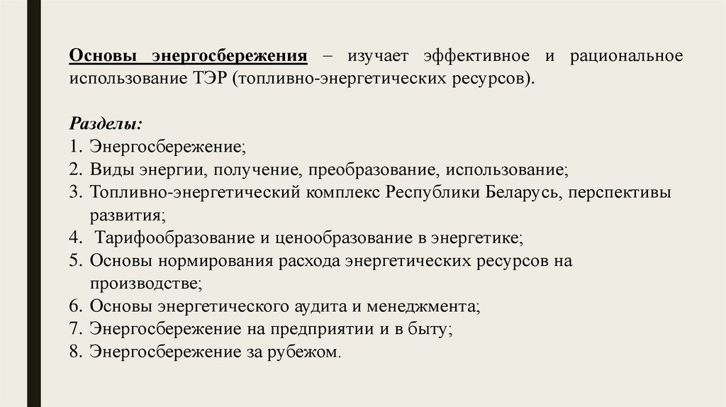 Основы энергосбережения – изучает эффективное и рациональноеиспользование ТЭР (топливно-энергетических ресурсов).