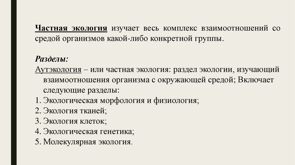 Частная экология изучает весь комплекс взаимоотношений сосредой организмов какой-либо конкретной группы.